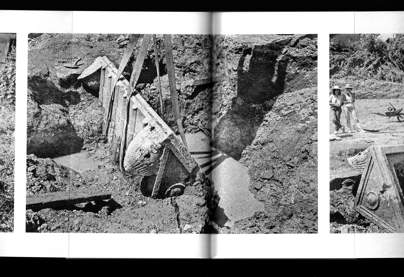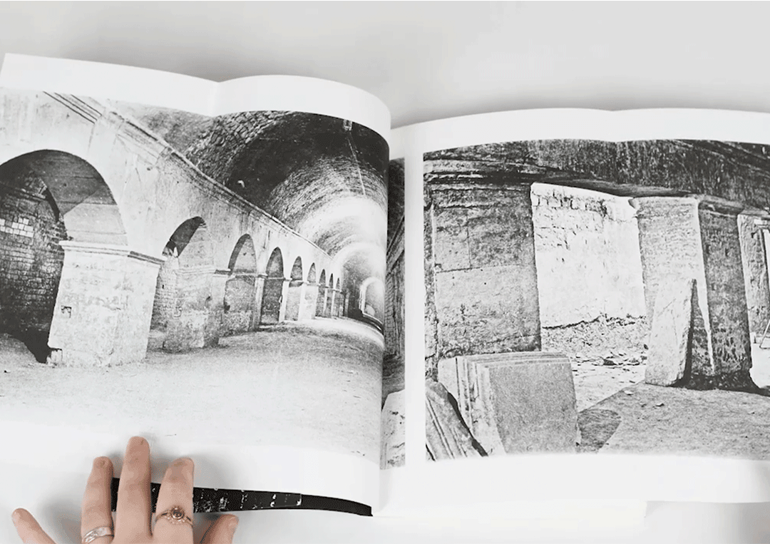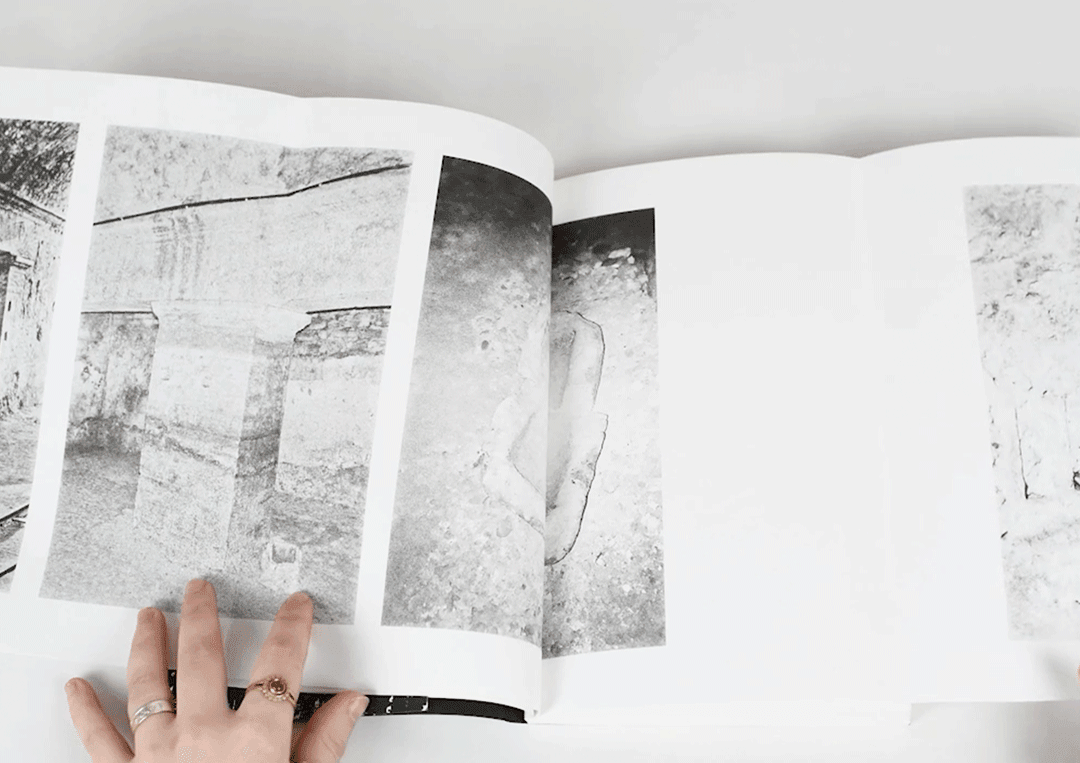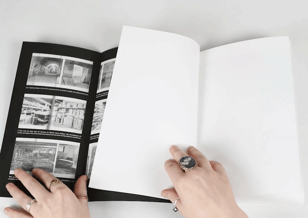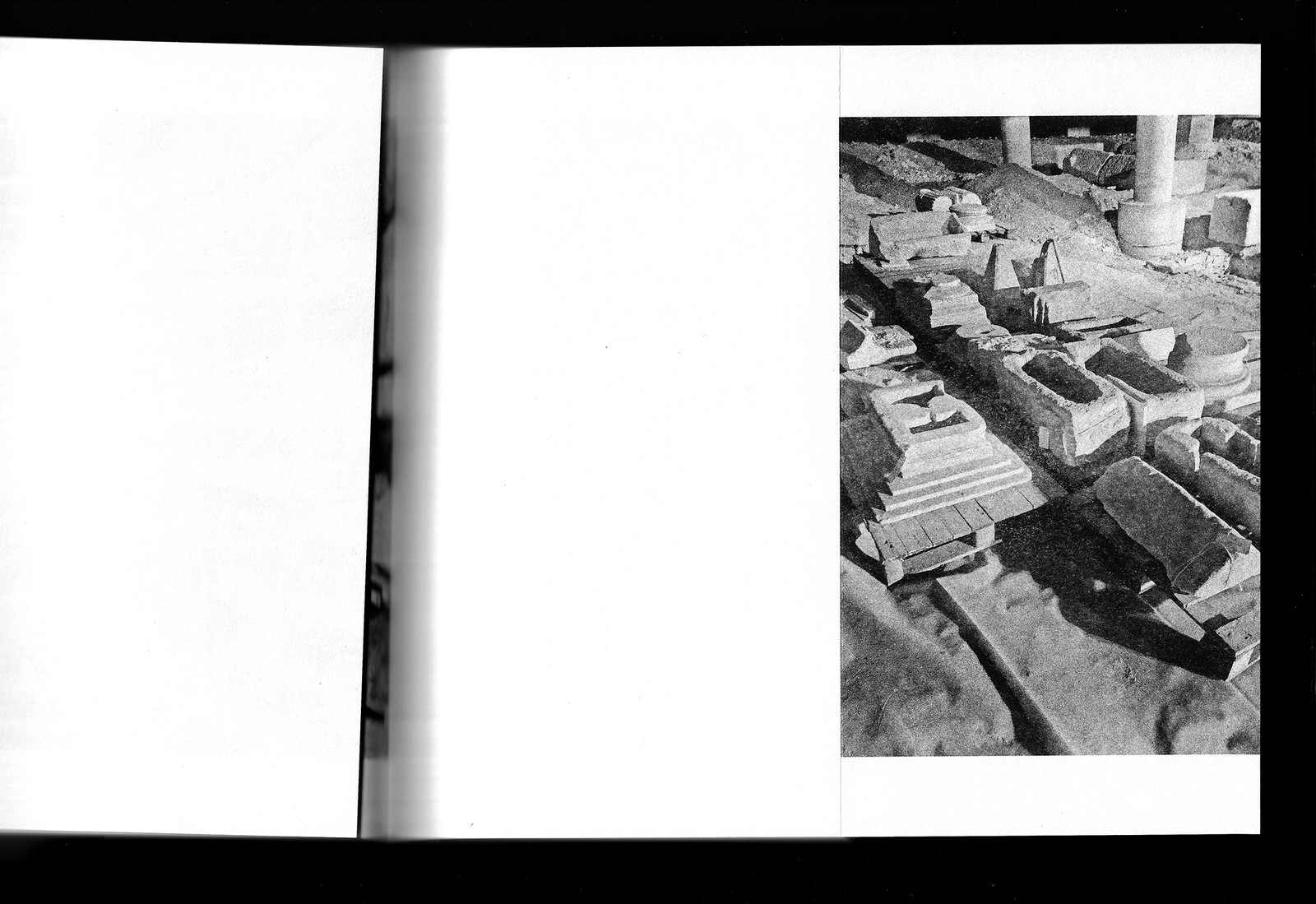 À la manière d’un tombeau qu’on exhume, d’un casier d’archives qu’on ouvre et referme, la surface vide des pages dissimulent dans leur plis une longue frise d’images. Elles présentent des réminiscences de la nécropole dans leur contexte contemporain, cherchant des occurrences où la ville des morts affleure à la surface des vivants.
