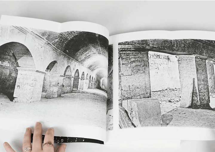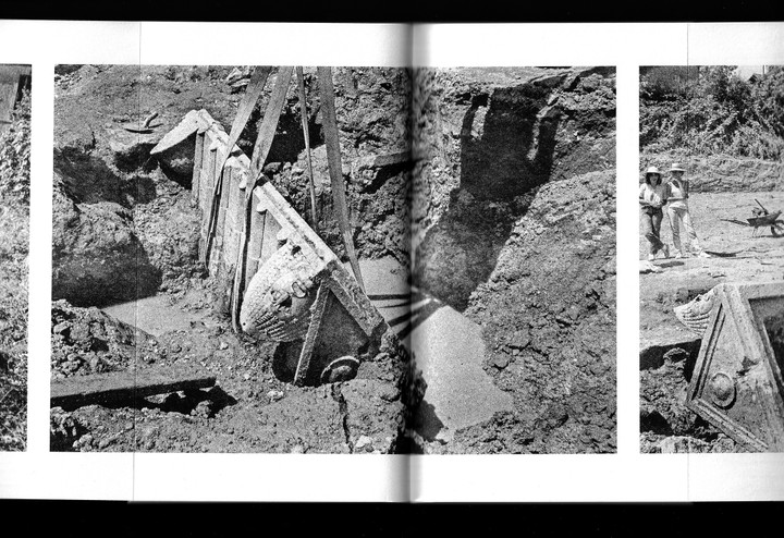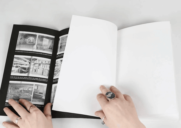 Like a tomb being unearthed, an archive being opened and closed, the empty surface of the pages hides a long frieze of images in their folds. They present reminiscences of the necropolis in their contemporary context, looking for instances where the city of the dead surfaces on the surface of the living.