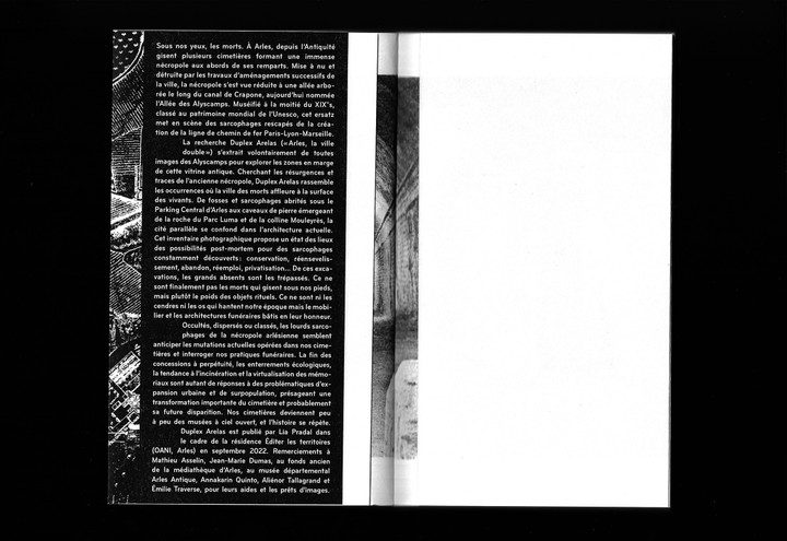 Project carried out during the residency Éditer les territoires #Arles (OANI) by Lia Pradal. The publication combines photographic contributions (Mathieu Asselin, Davide Fecarotti) with the archives of the Musée Départemental Arles Antique and the Arles media library.