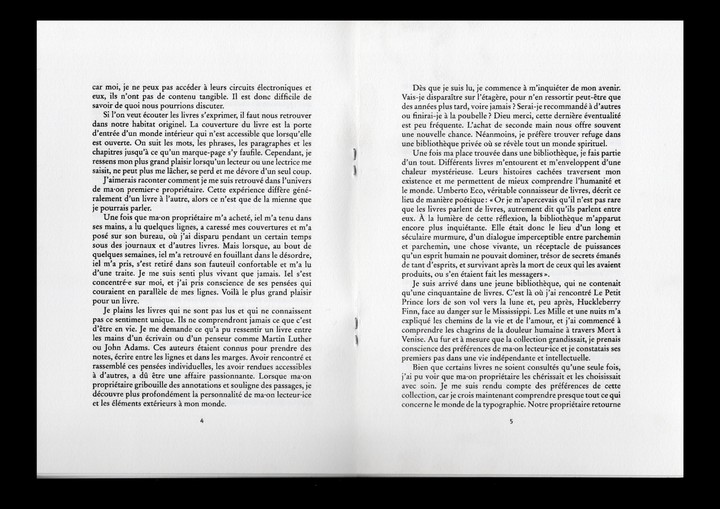 Monologue intérieur d’un livre est un concept qui tente de contempler l’état du codex d’un point de vue unique. Le Monologue lit les pensées d’un livre qui se demande si le codex survivra sous sa forme traditionnelle ou si le livre numérique, son cousin plus jeune, prendra sa place. Ce sont les réflexions d’un livre conscient de lui-même, qui se penche sur les grands triomphes remportés au cours des siècles par le papier et les textes reliés.
