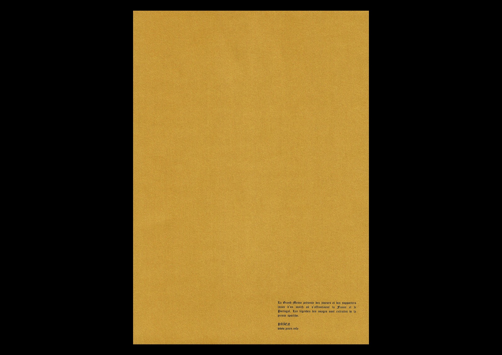 « La Grand-Messe » présente des joueurs et des spectateurs de la finale de l'Euro 2016 entre la France et le Portugal. Les sujets sont pris dans des poses extatiques, animés par une force mystique qui semble émaner du jeu. Ces images sont légendées par des extraits de paroles de commentateurs sportifs, extraits qui s'appuient sur un vocabulaire biblique, mêlant sport et religion.